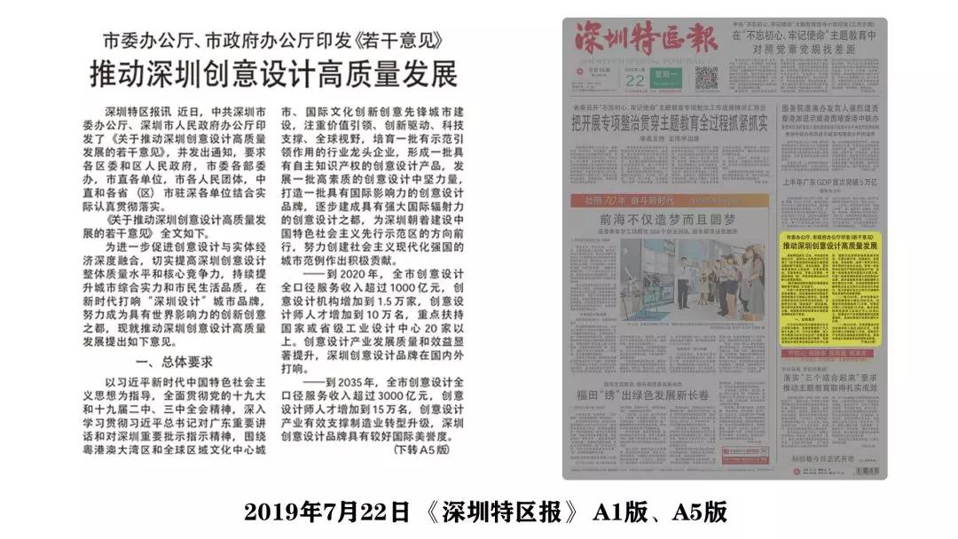 深圳特区报讯 近日,中共深圳市委办公厅、深圳市人民政府办公厅印发了《关于推动深圳创意设计高质量发展的若干意见》,并发出通知,要求各区委和区人民政府,市委各部委办,市直各单位,市各人民团体,中直和各省(区)市驻深各单位结合实际认真贯彻落实。