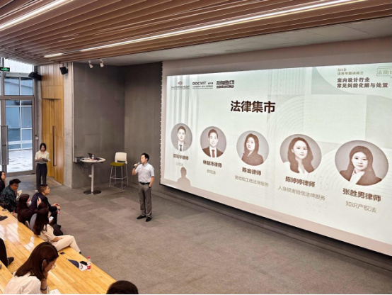 法律服务集市环节,为使法律知识更加融会贯通,主持人通过融入式、互动式的普法形式,总结了五个设计行业企业最关心的涉法涉诉问题分别向五位律师进行提问。